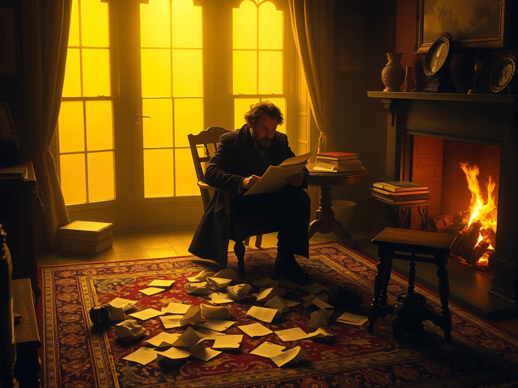 “Confound it all!” Dickens muttered, crumpling another sheet of foolscap and hurling it toward the fireplace. The paper ball joined a dozen others scattered across the Persian rug—each one a failed attempt to breathe life into what should have been a simple scene. Arthur was to meet his mother. Nothing more. Yet the words sat upon the page like lead weights, refusing to dance with their customary vigor.